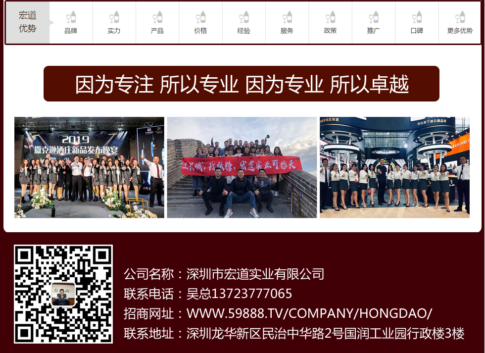 深圳市宏道实业有限公司,创立于2008年,公司从创立初期至今十余载春秋,成为多家国外知名酒庄的中国地区运营商,拥有十多年的红酒、白酒运营经验,在全国已经建立了完善的销售网络和销售团队,是一家致力于酒文化传播,红酒、白酒加盟代理,酒水供应链服务为一体的酒水运营商。