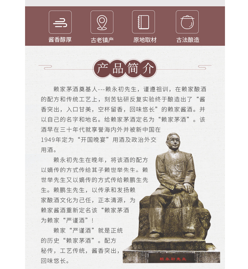 赖永初先生在晚年,将该酒的配方以嫡传的方式传给其子赖世举先生。赖世举先生又以嫡传的方式传给赖鹏生先生。赖鹏生先生,以传承和发扬赖家酿酒文化为己任,正本清源,为赖家酱酒重新定名该“赖家茅酒为赖家“严谨酒”!